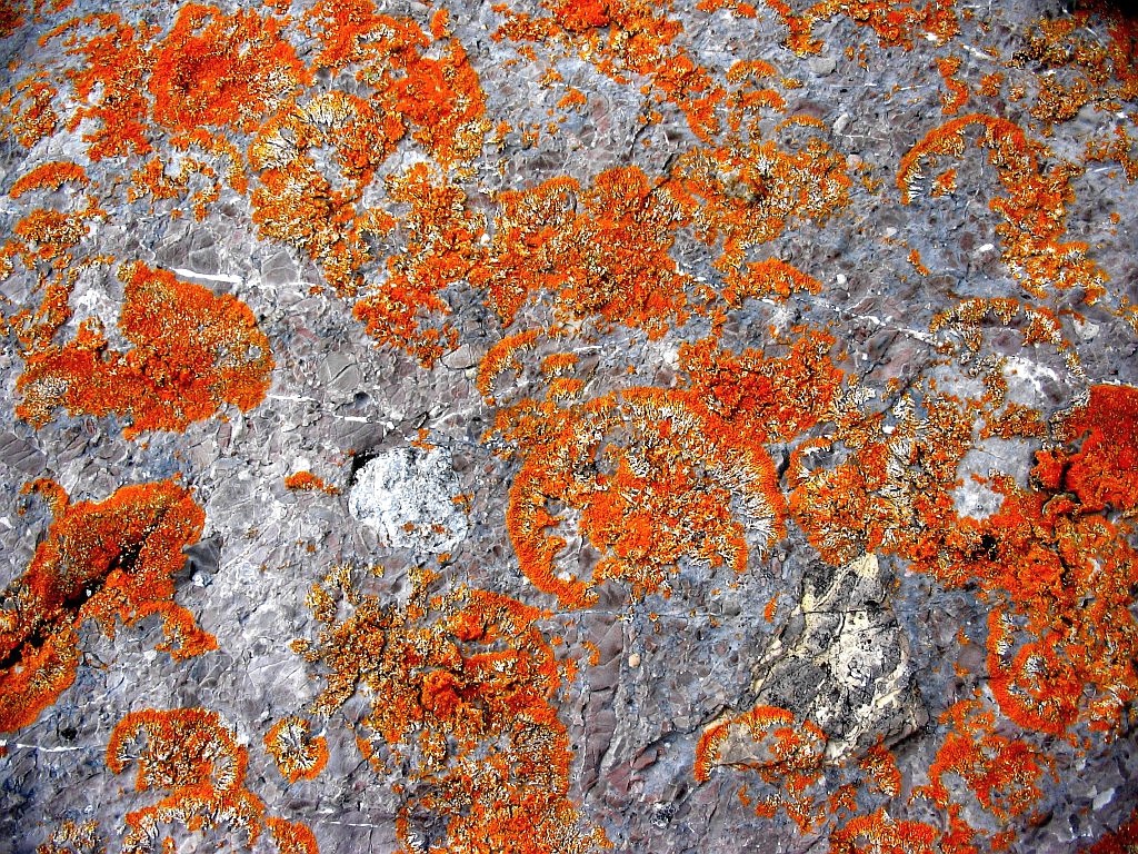 Sunburst Lichen (Xanthoria elegans). On "limestone". Cow Head Headland. Photo: Pat/Dan Montague. [CLICK image to enlarge.]